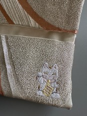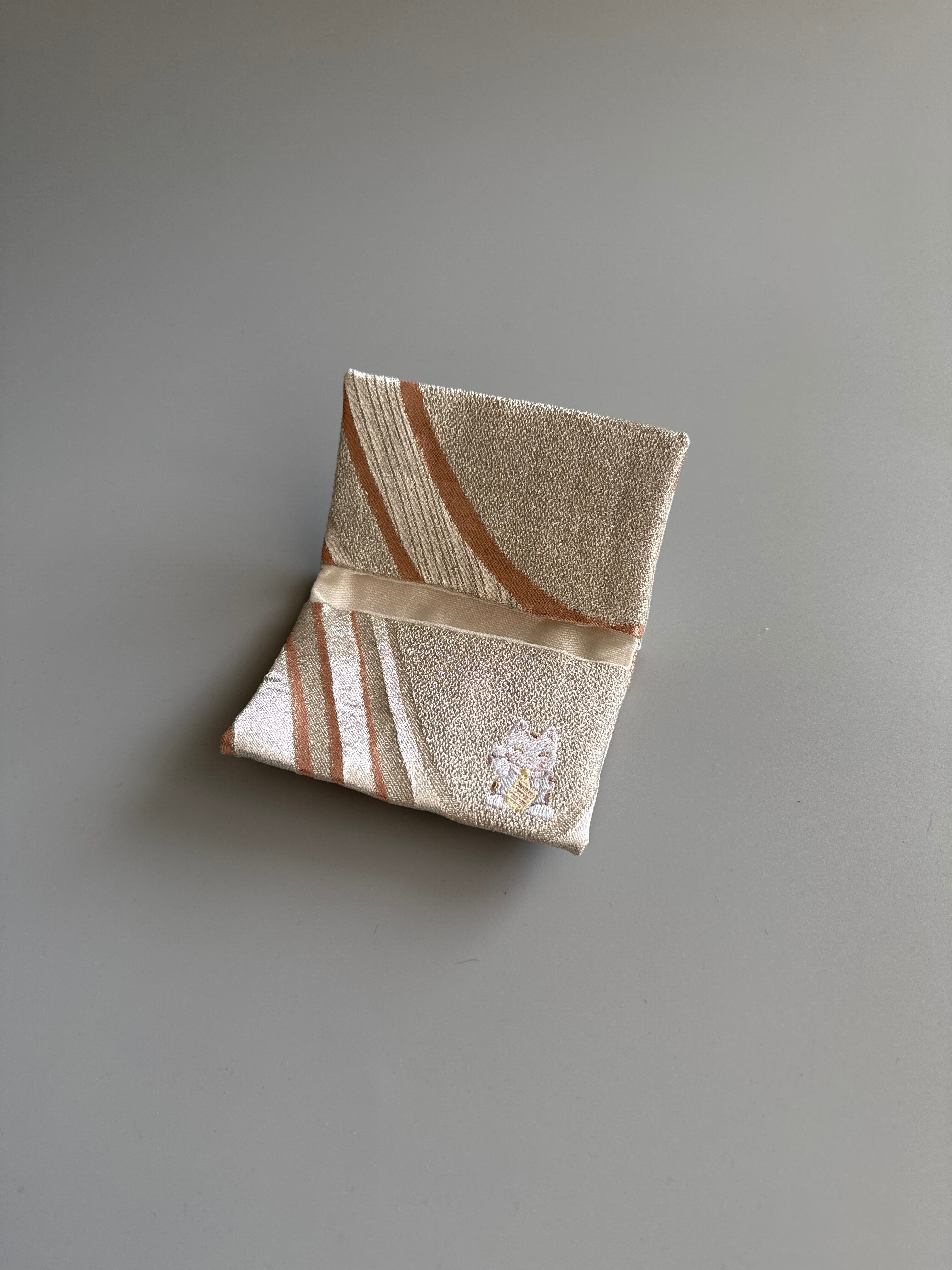 この帯カードケースは、アップサイクルされた帯生地を使用したかわいらしいアイテムです。ナチュラルなカラーの招き猫の刺繍が施されており、日常のさまざまなシーンで役立つこと間違いありません!
